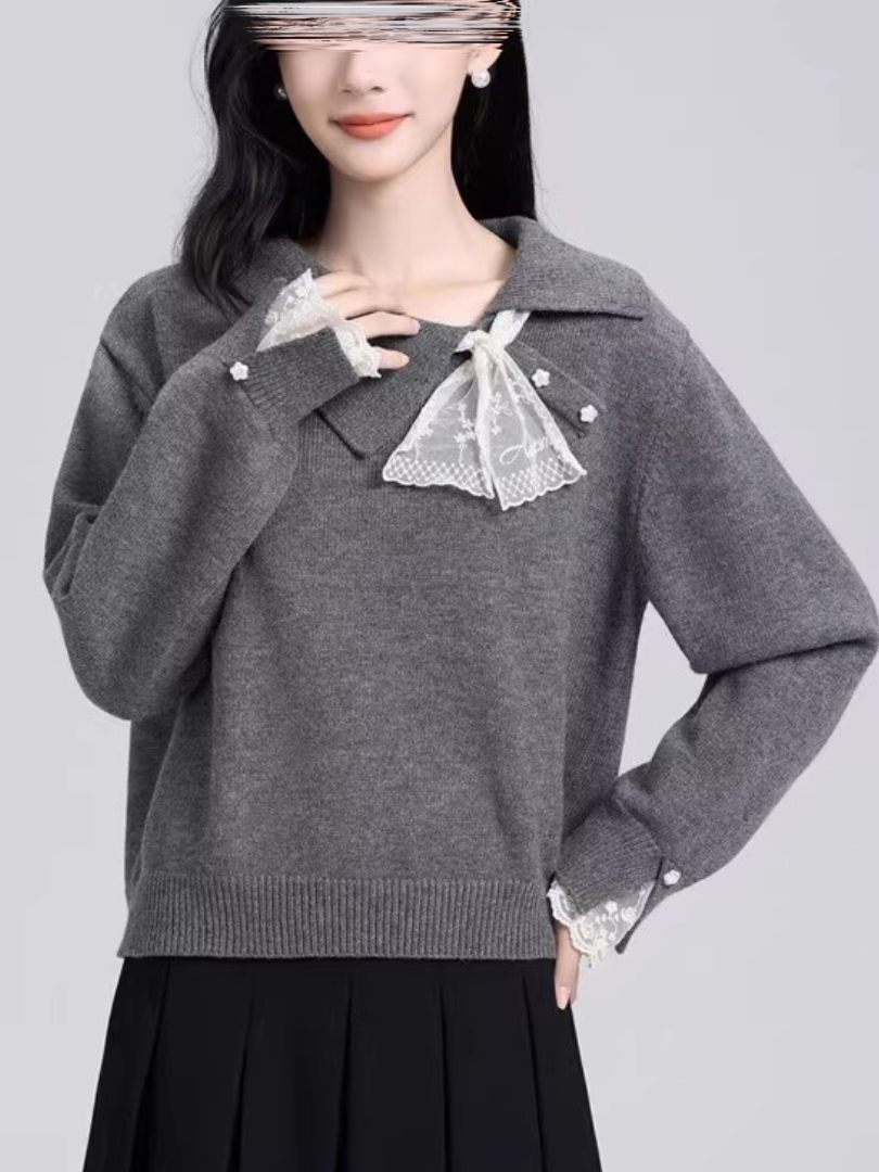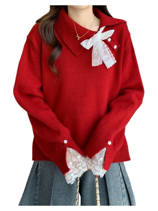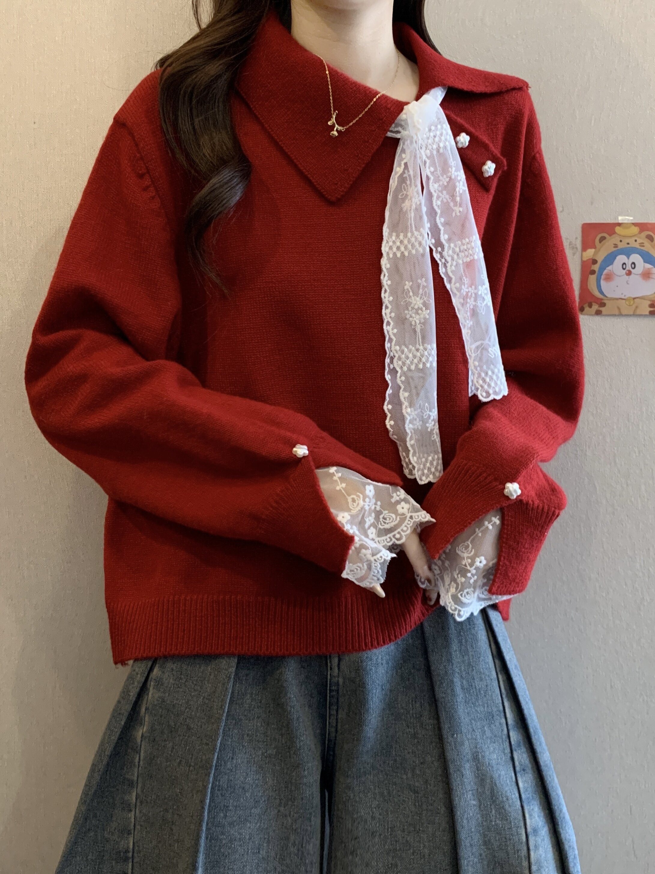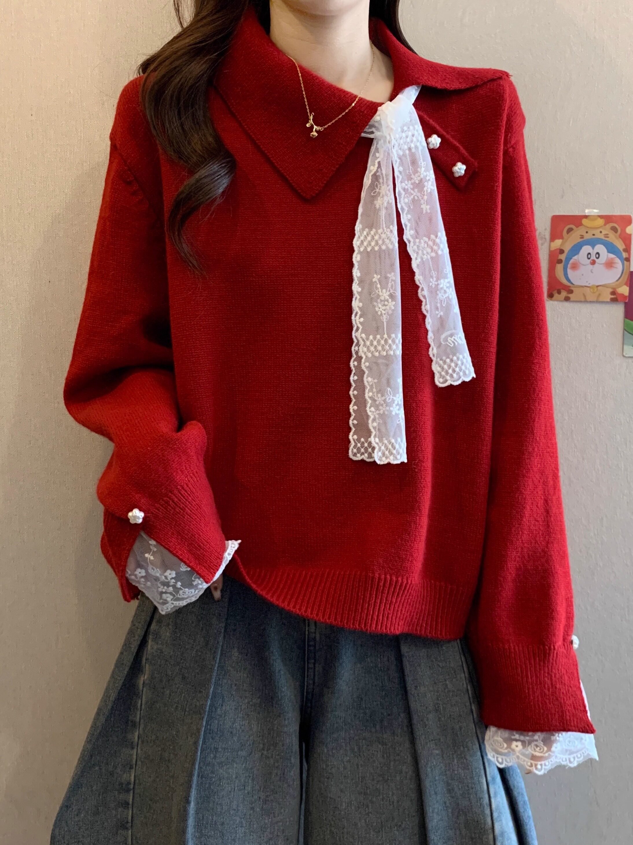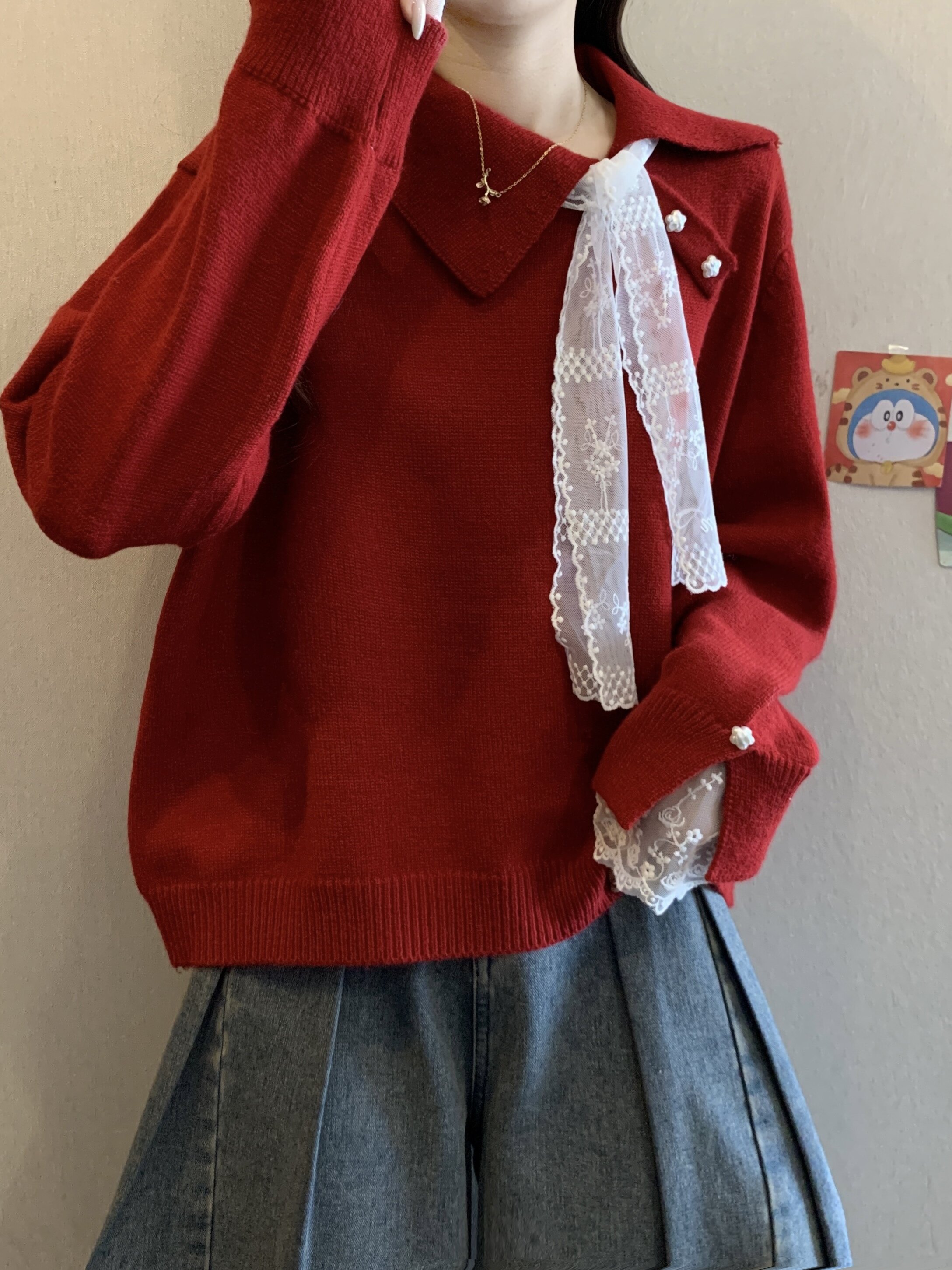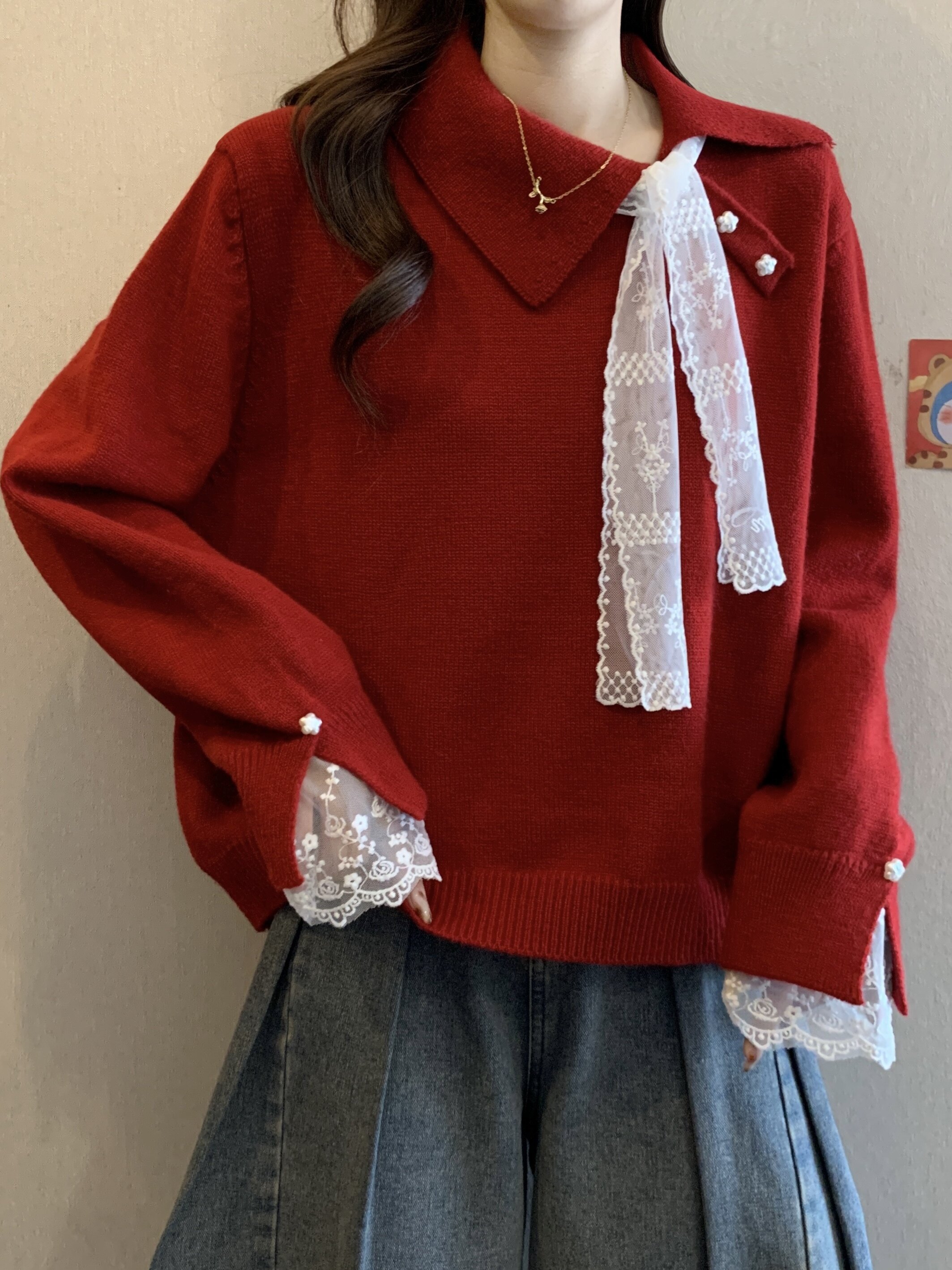 高级感红色毛衣秋冬2025新款大码女装胖mm绝美蕾丝拼接针织衫上衣