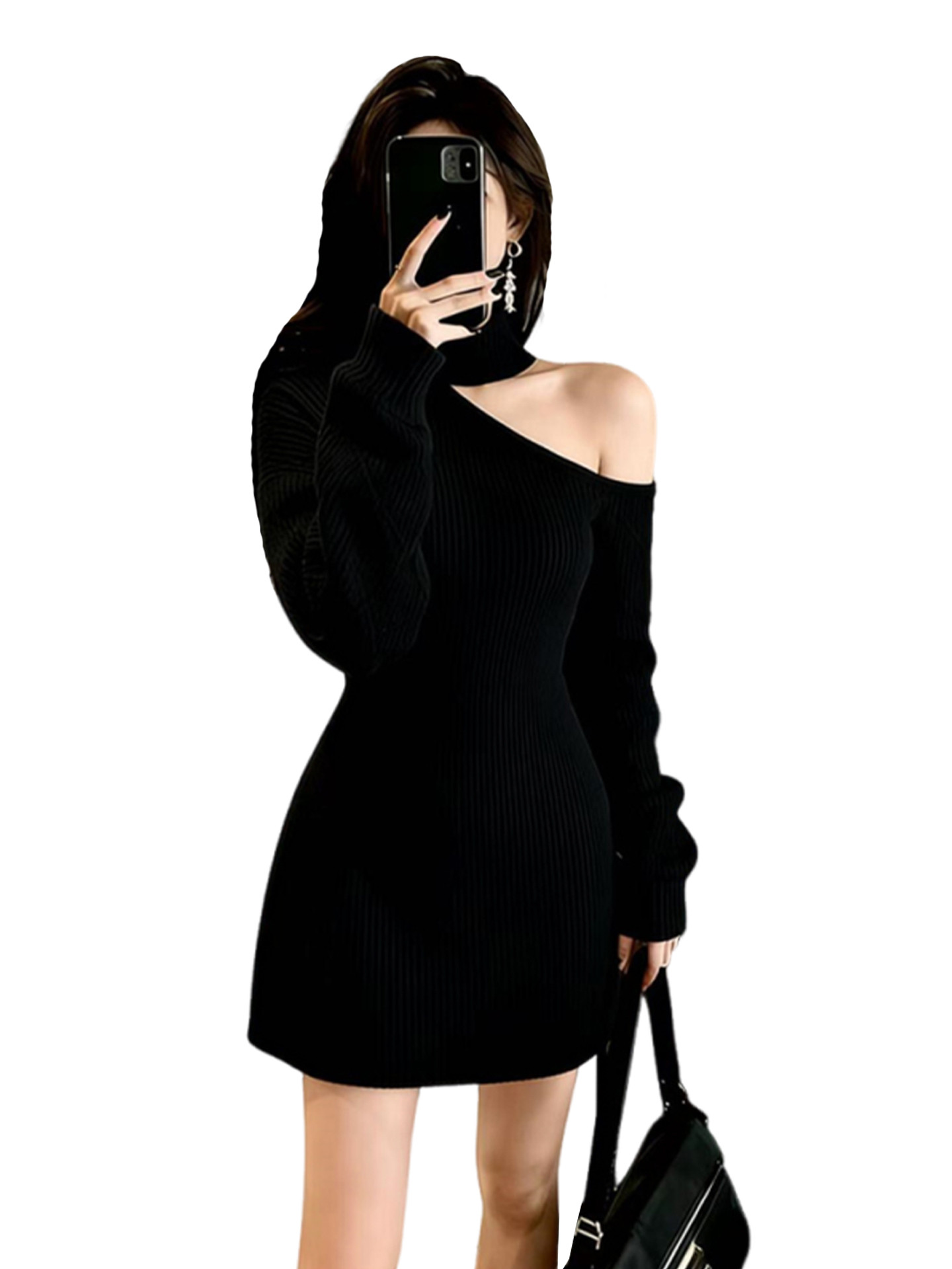 法式赫本风黑色斜肩针织连衣裙女秋冬2026新款小个子收腰包臀短裙