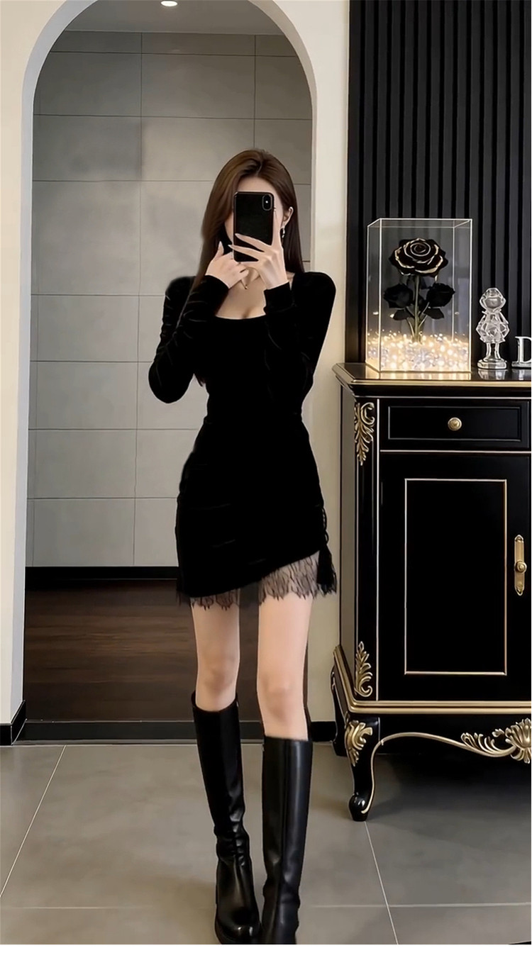2026新款法式赫本风黑色蕾丝连衣裙子女2025秋冬季御姐穿搭包臀裙
