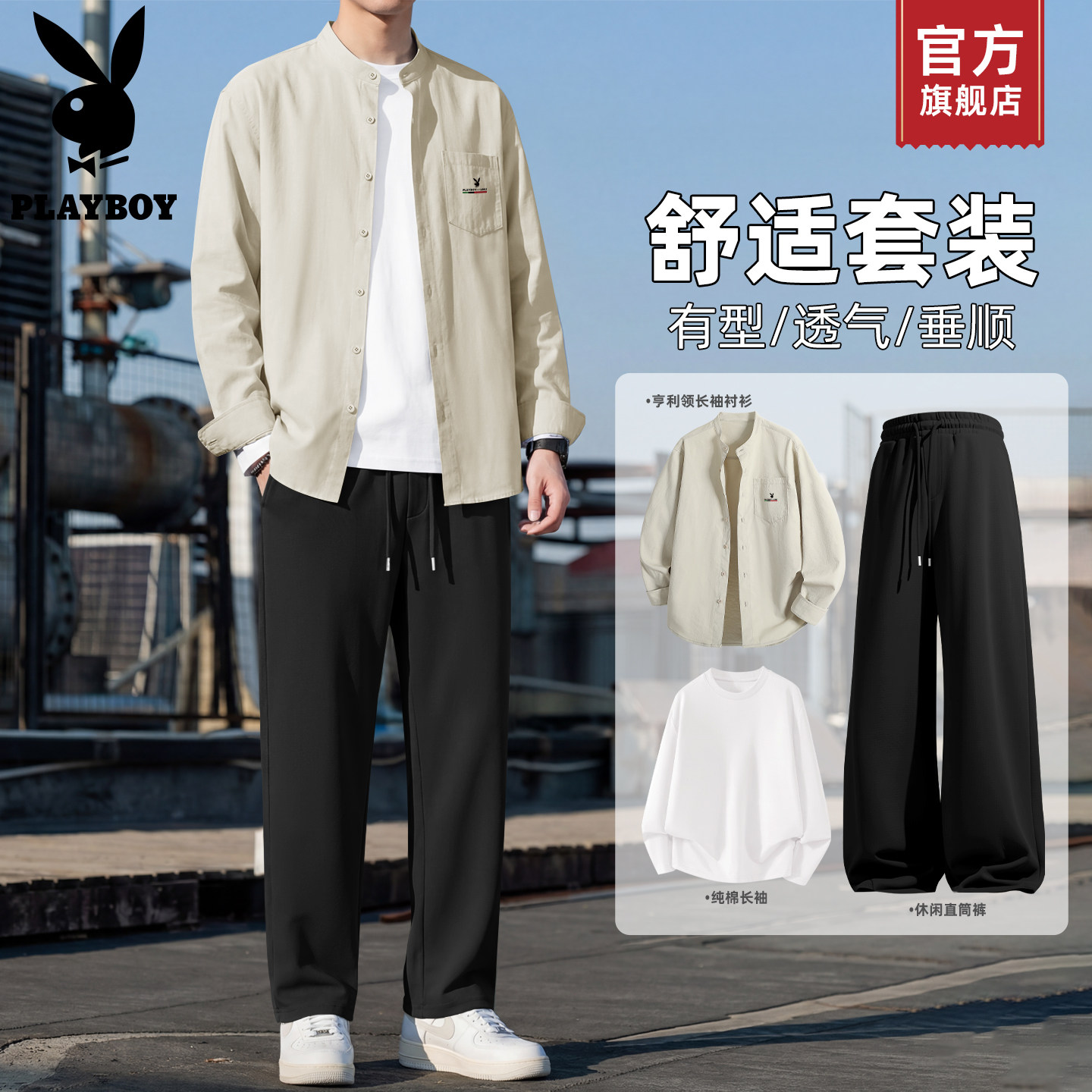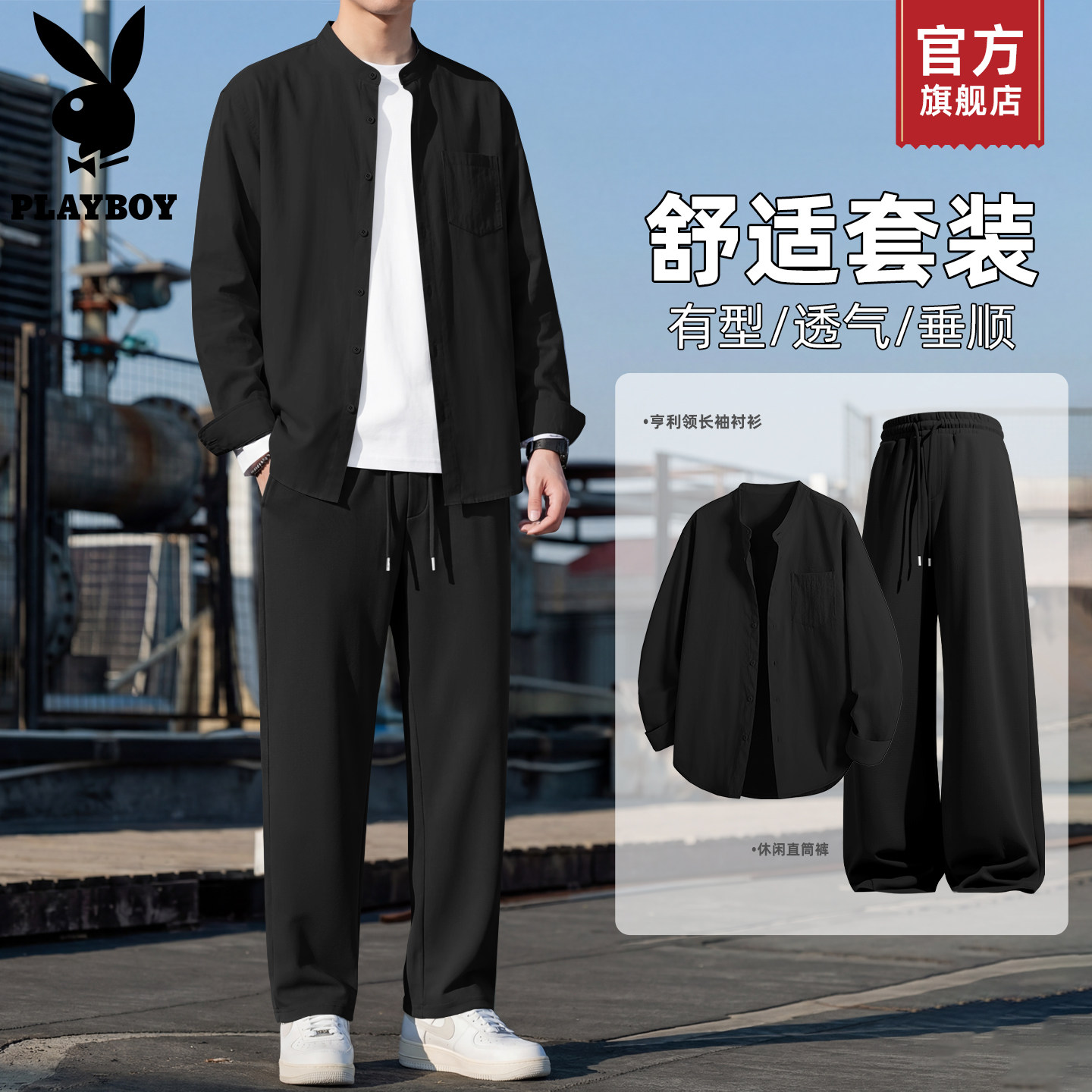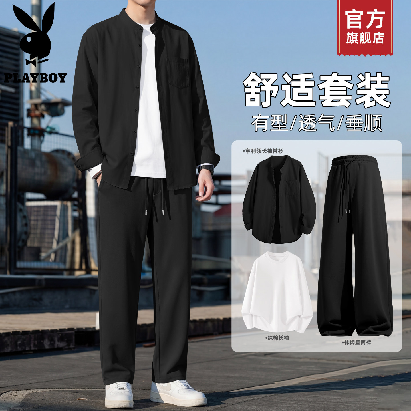 花花公子潮流休闲套装男春季立领长袖衬衫男士穿搭一整套高级感Y