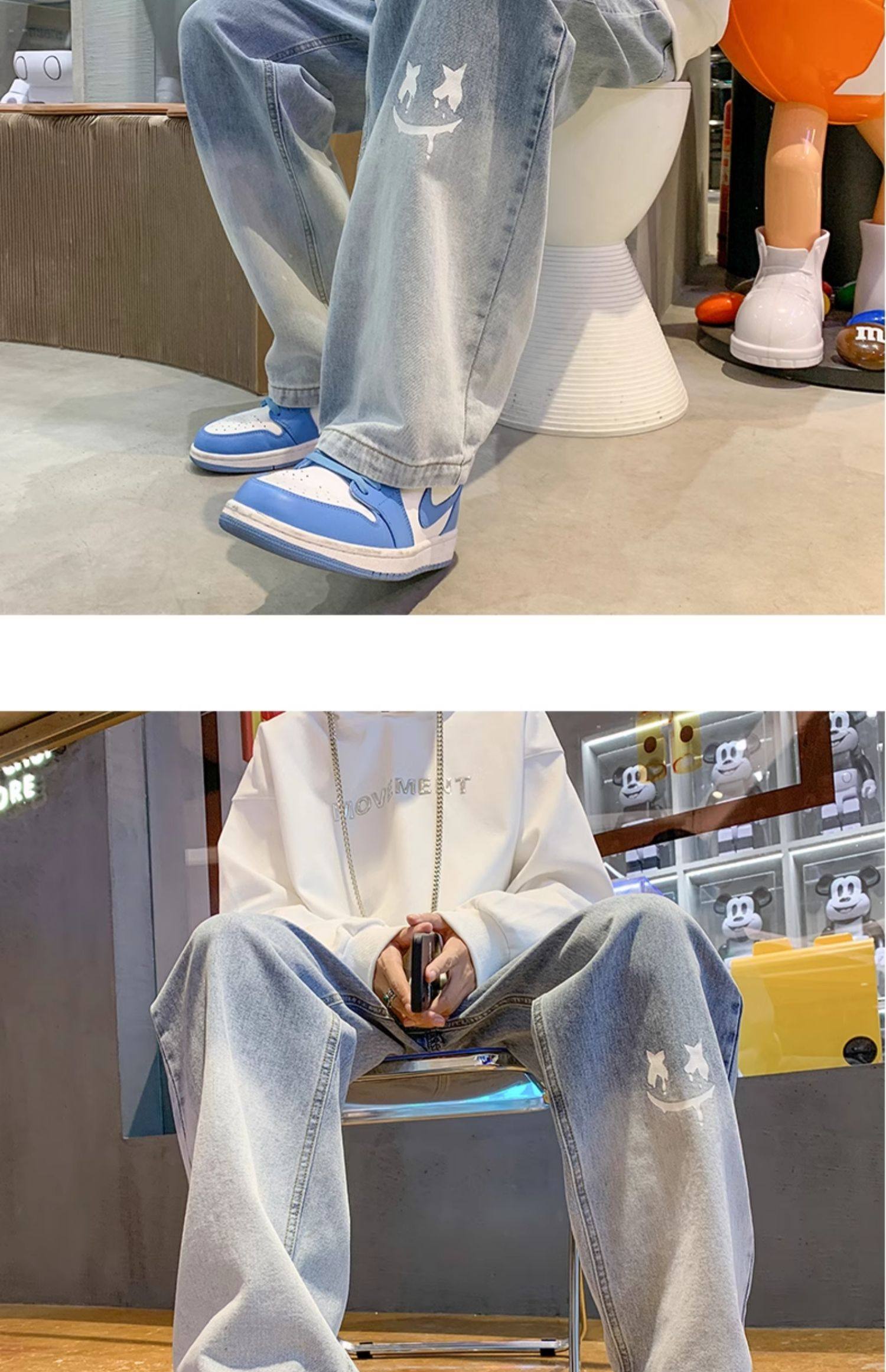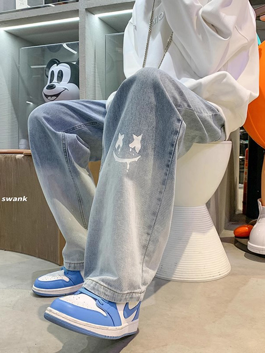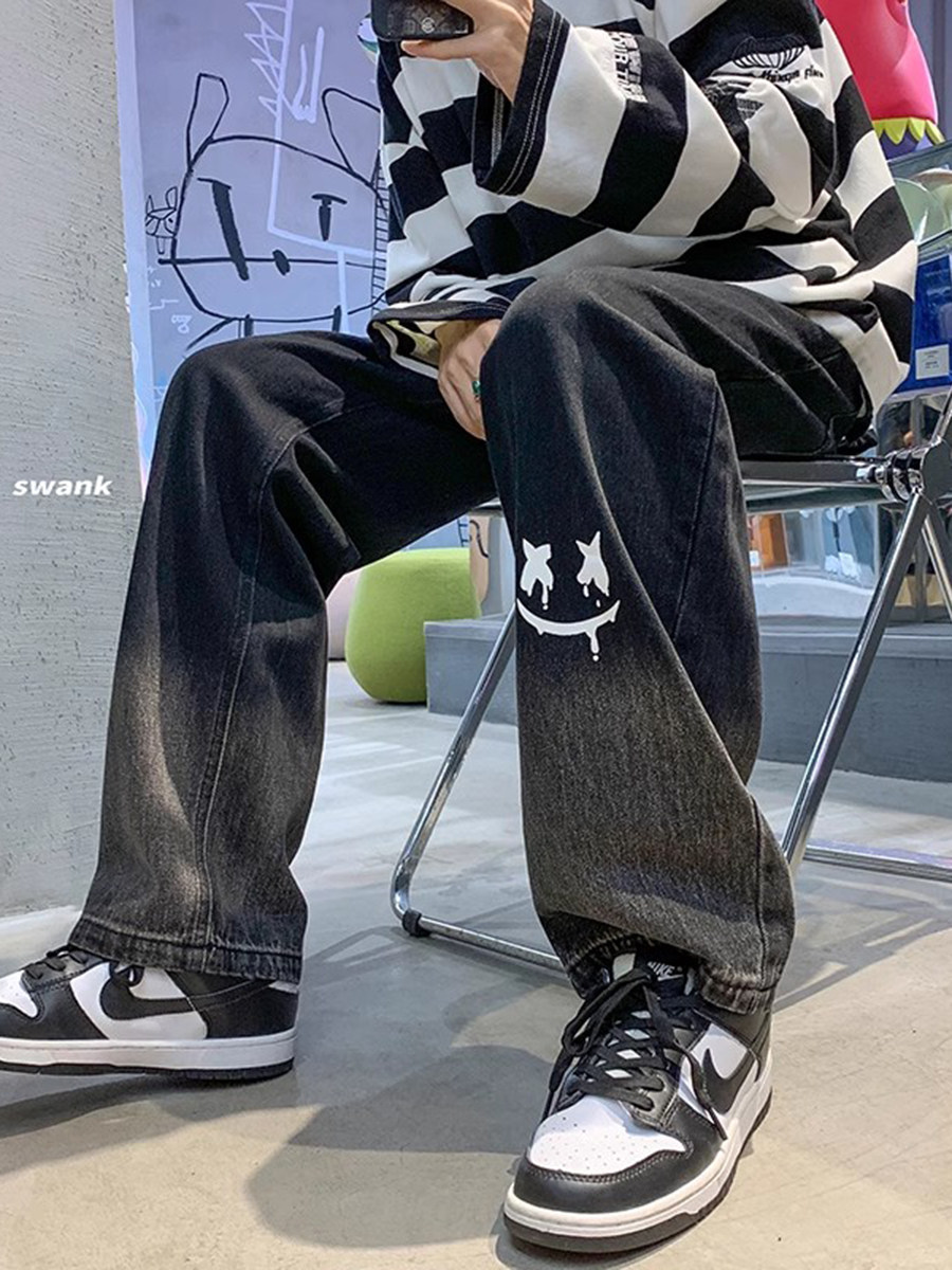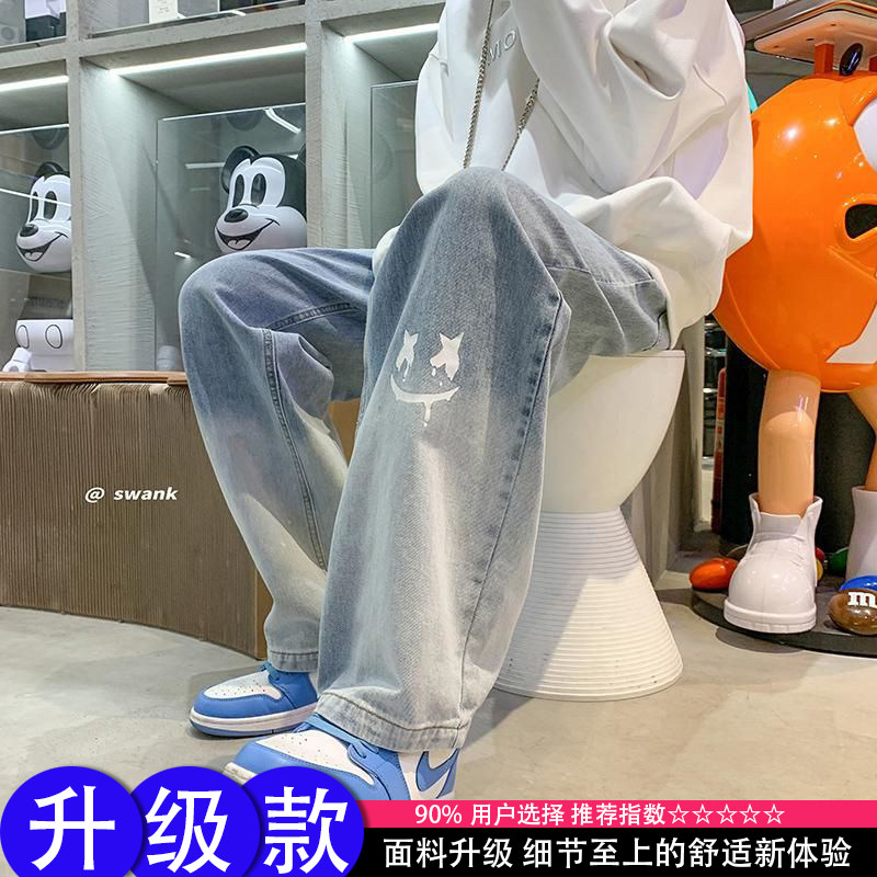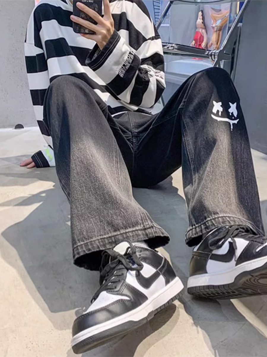 美式男款裤子潮牌新款秋季笑脸涂鸦水洗复古牛仔裤宽松直筒阔腿裤
