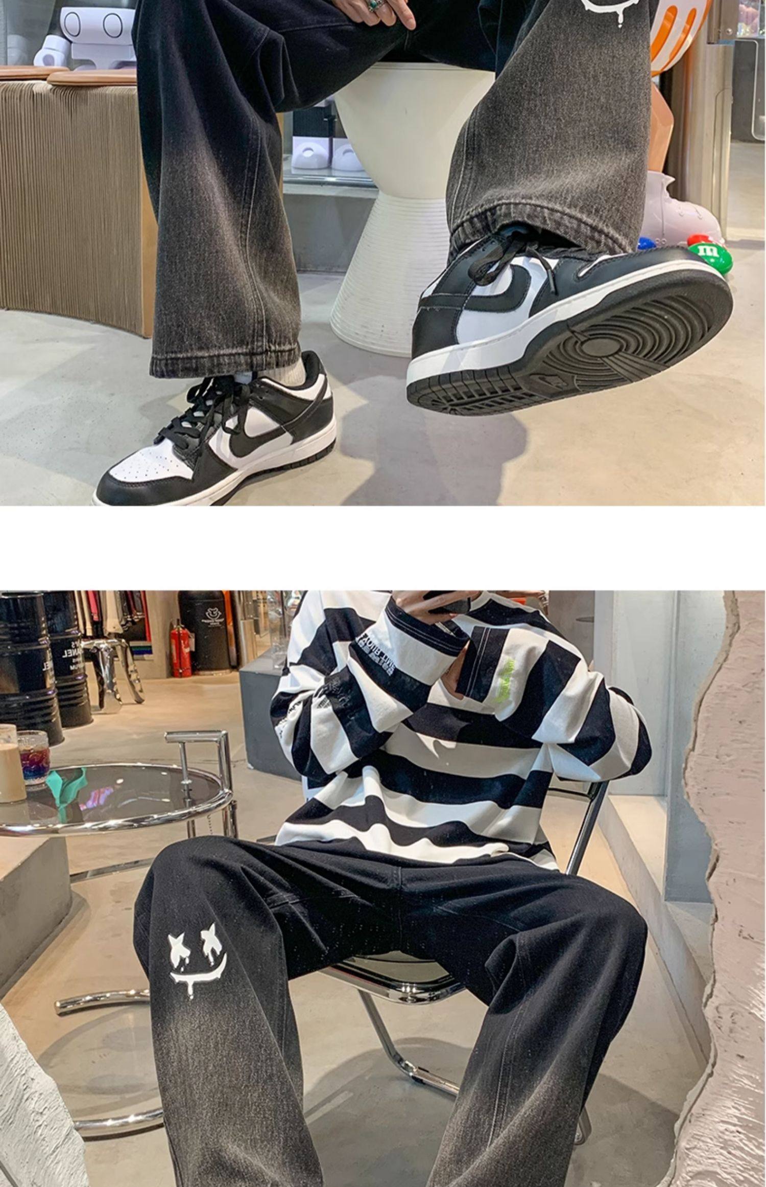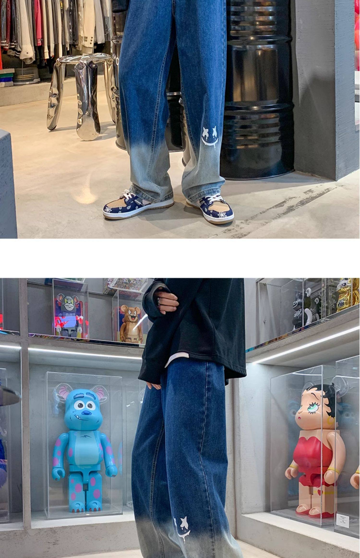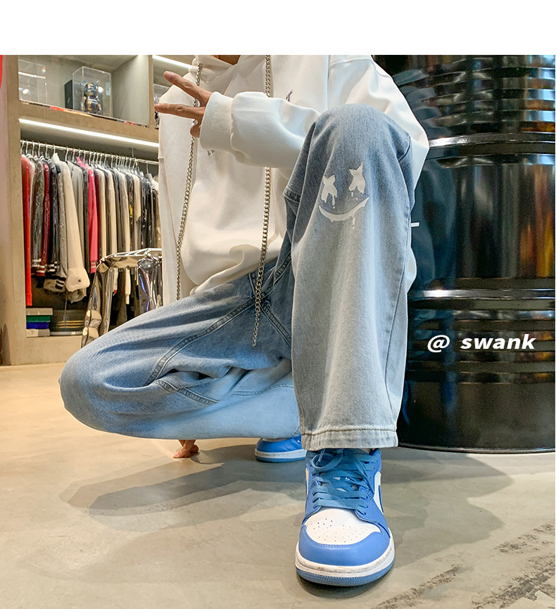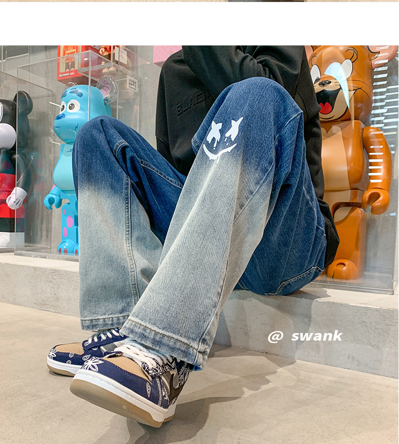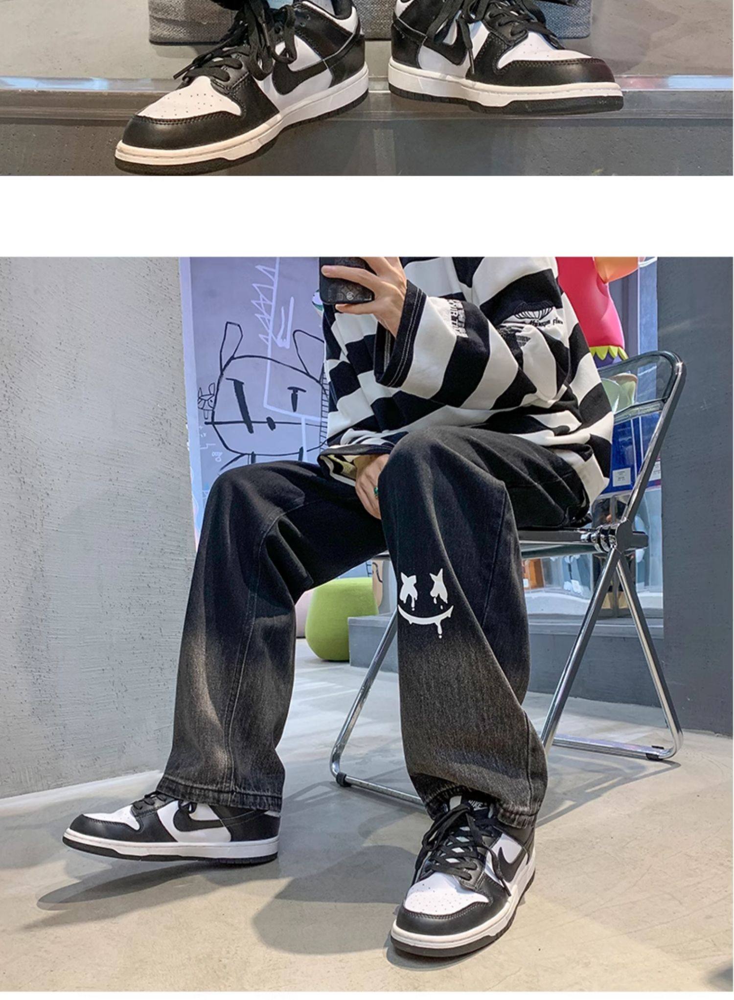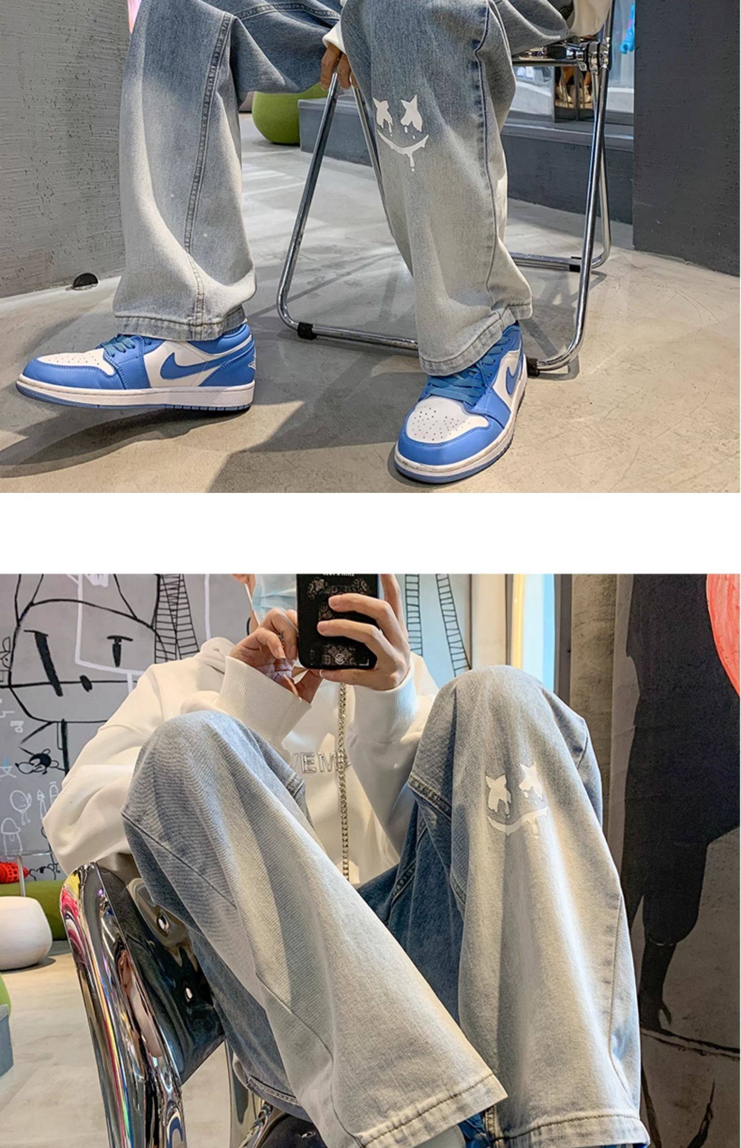 美式男款裤子潮牌新款秋季笑脸涂鸦水洗复古牛仔裤宽松直筒阔腿裤
