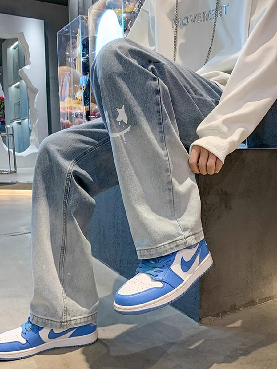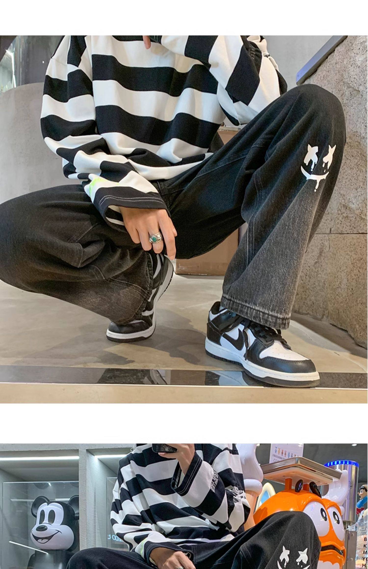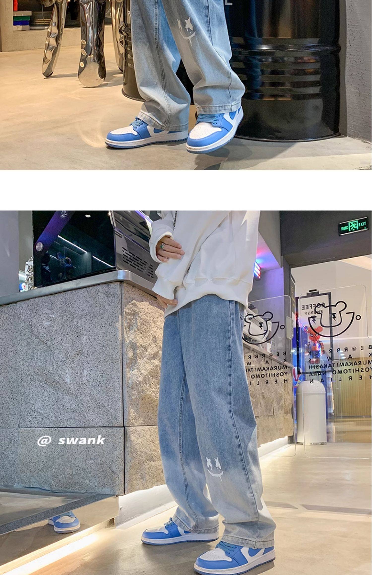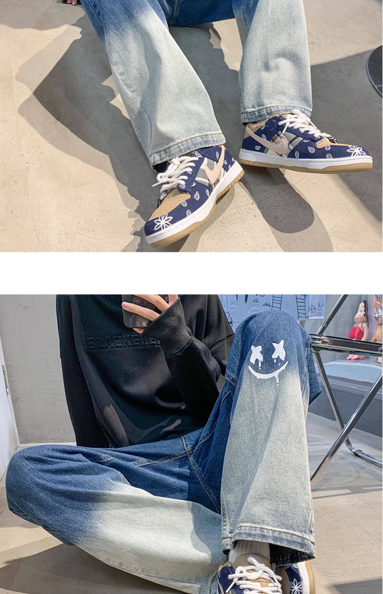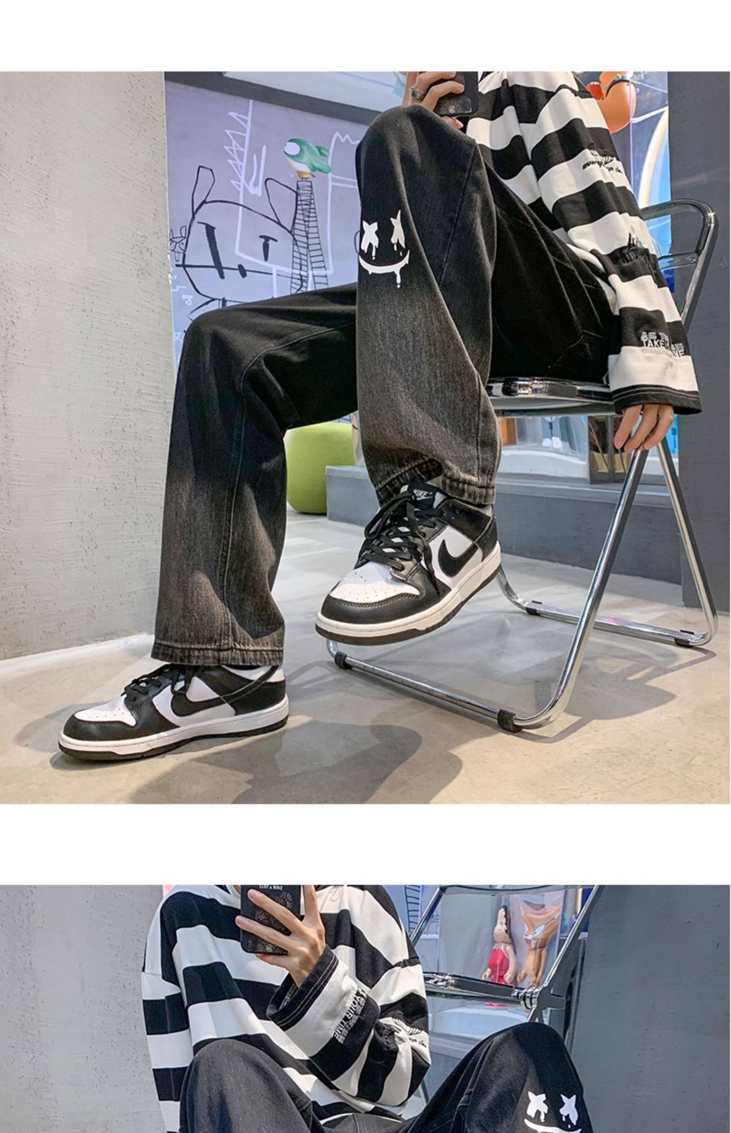 美式男款裤子潮牌新款秋季笑脸涂鸦水洗复古牛仔裤宽松直筒阔腿裤