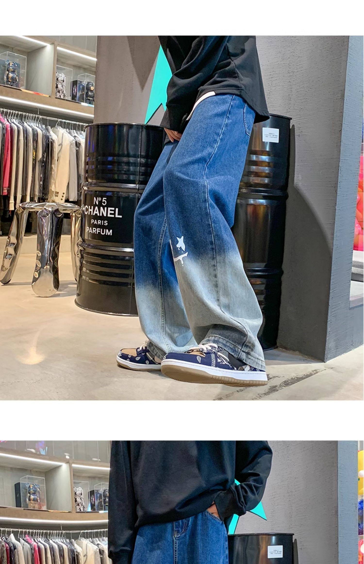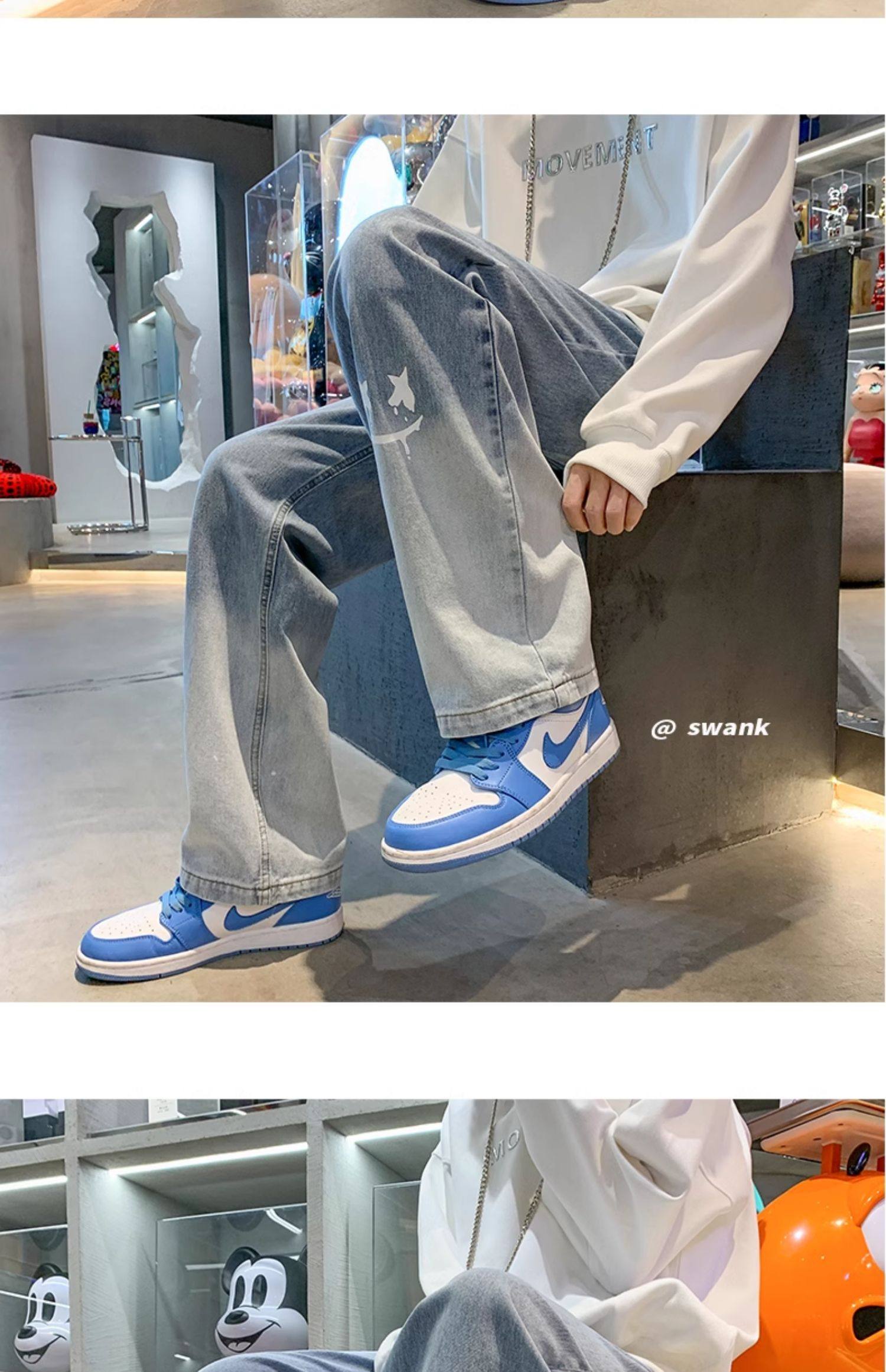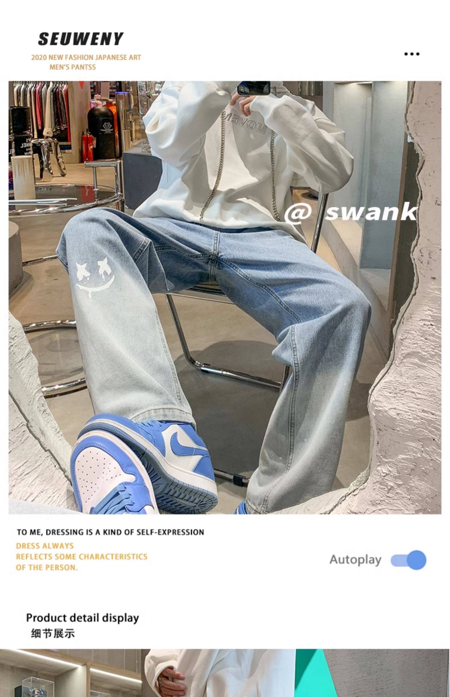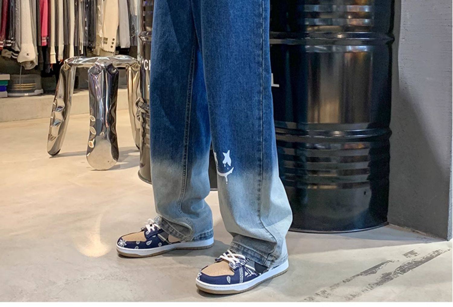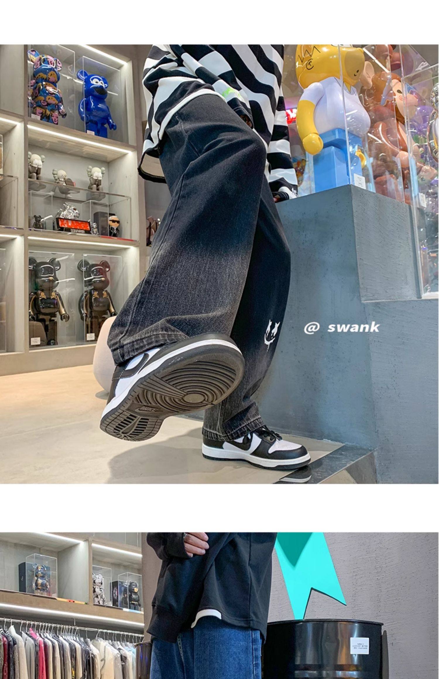 美式男款裤子潮牌新款秋季笑脸涂鸦水洗复古牛仔裤宽松直筒阔腿裤