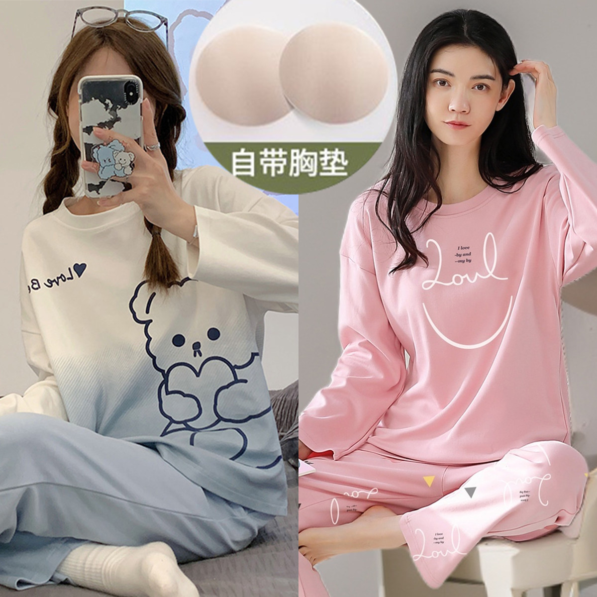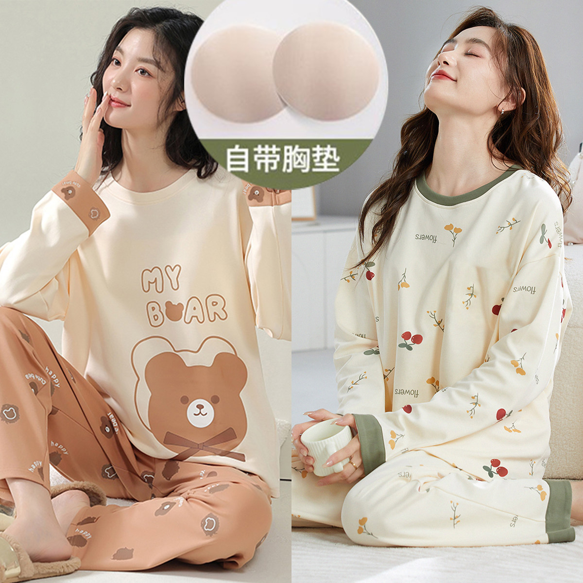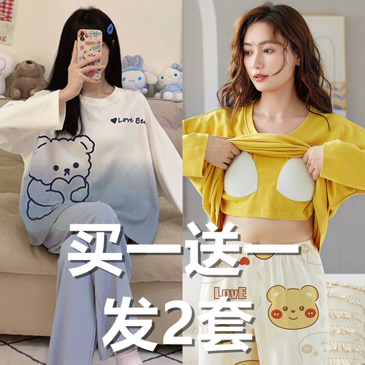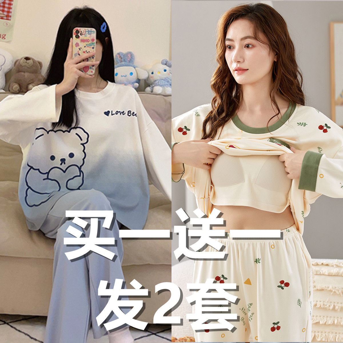 【买一送一】睡衣女春秋季长袖纯棉带胸垫高颜值家居服可外穿套装