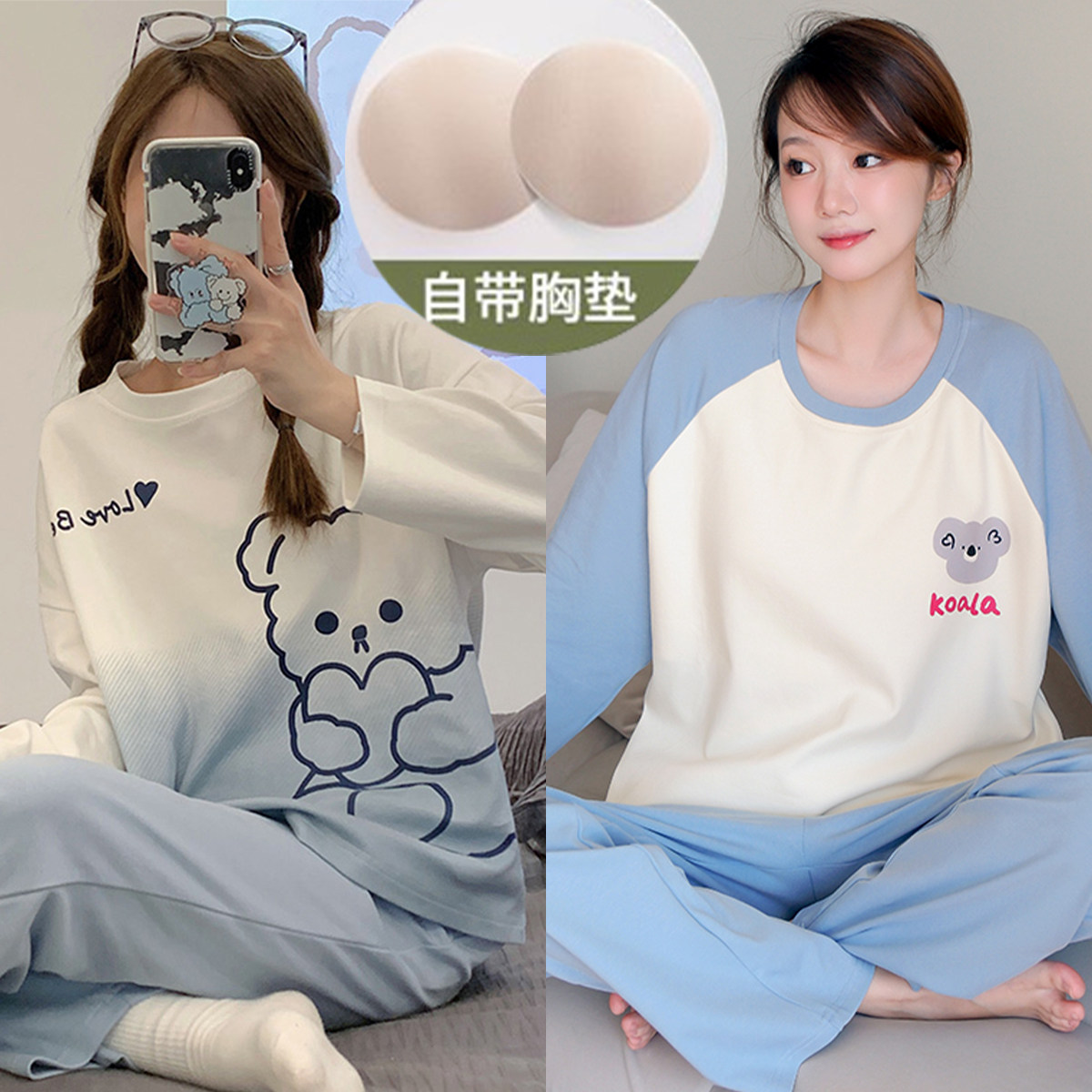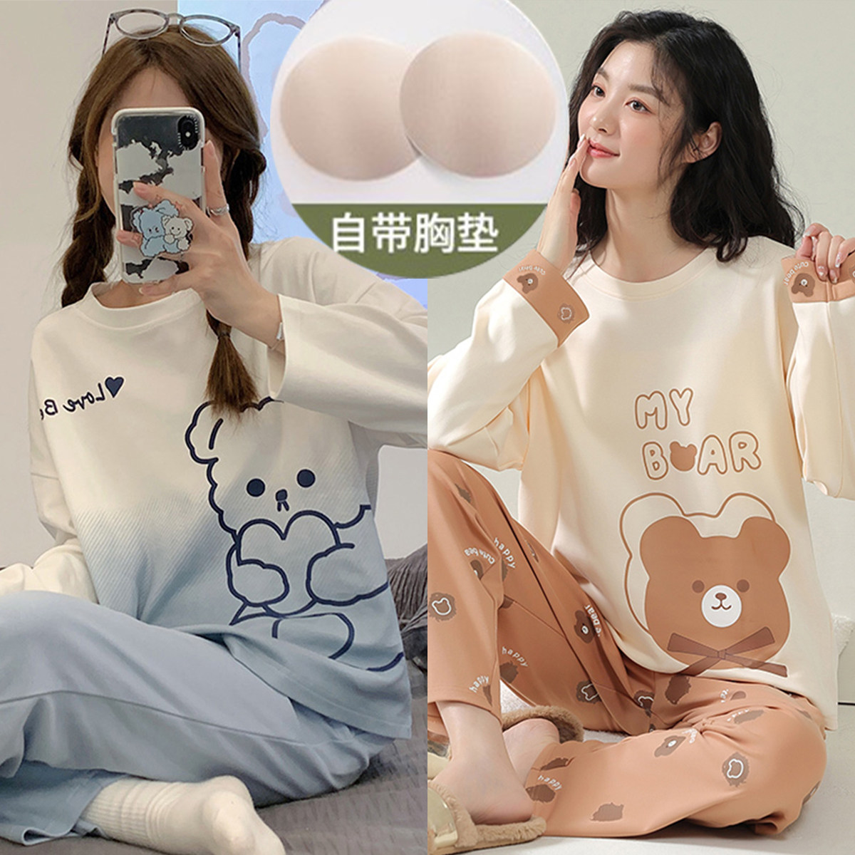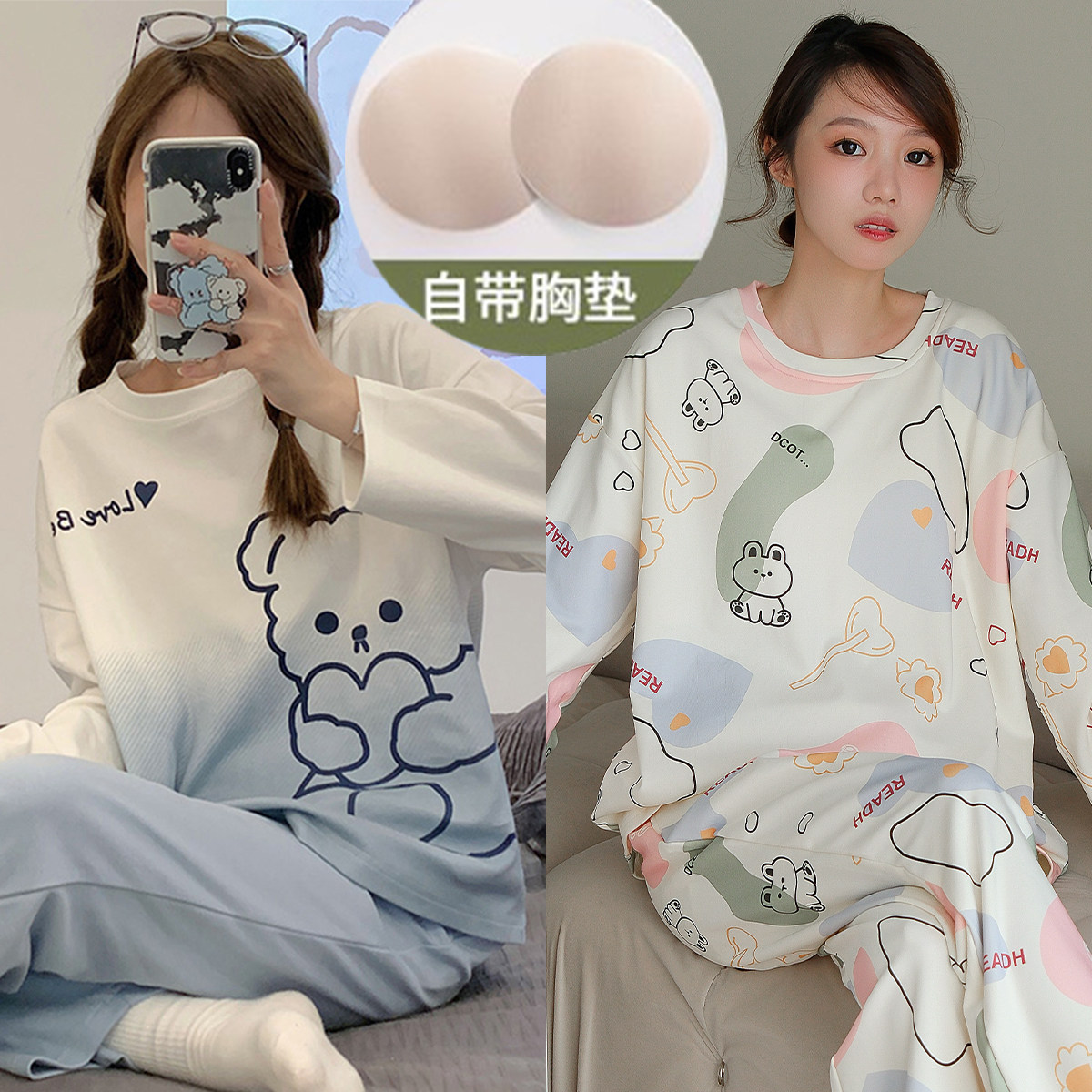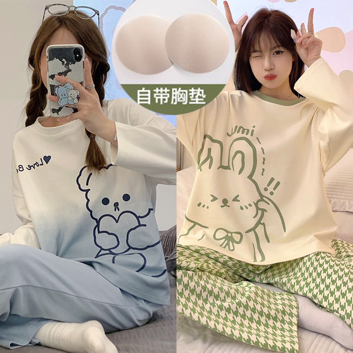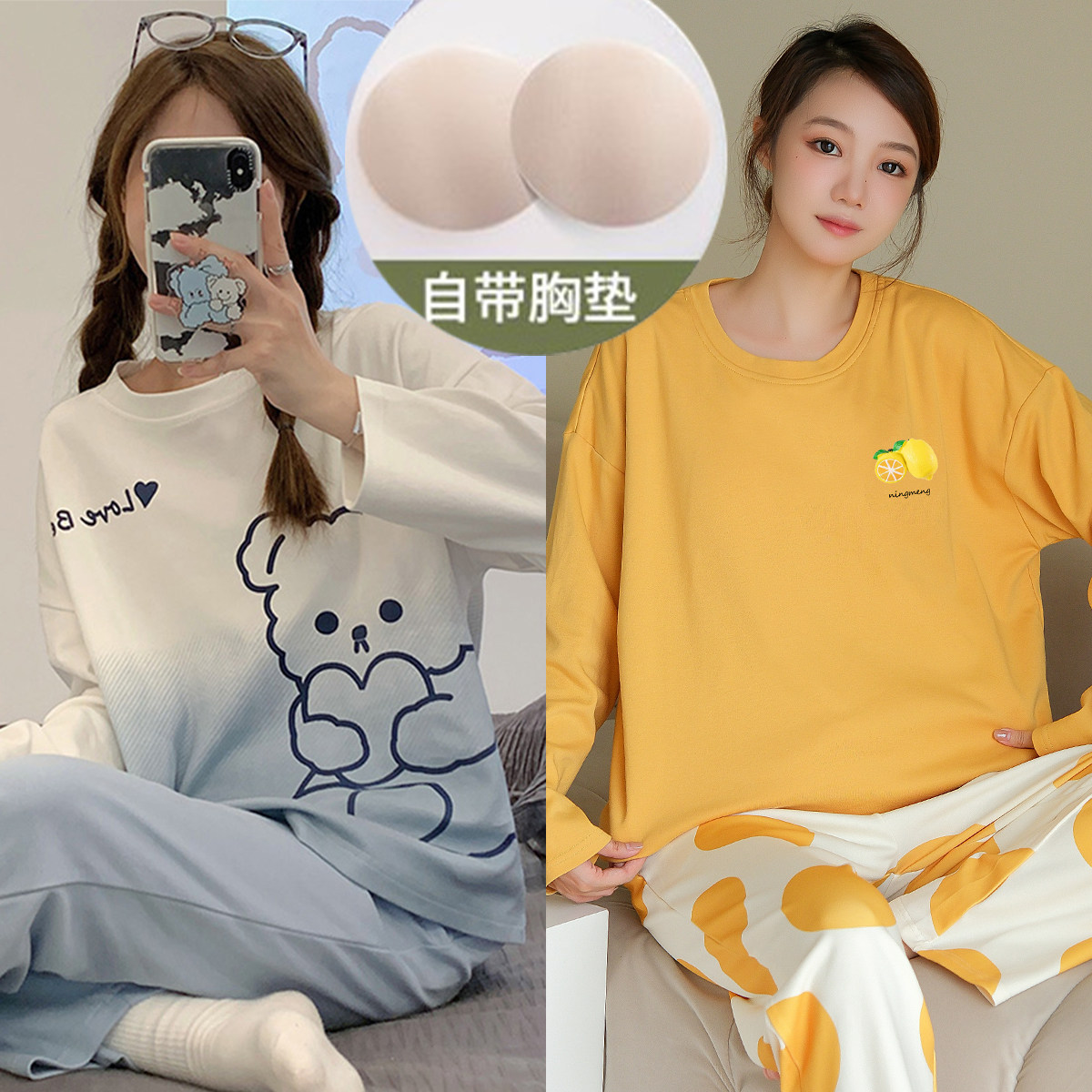 【买一送一】睡衣女春秋季长袖纯棉带胸垫高颜值家居服可外穿套装