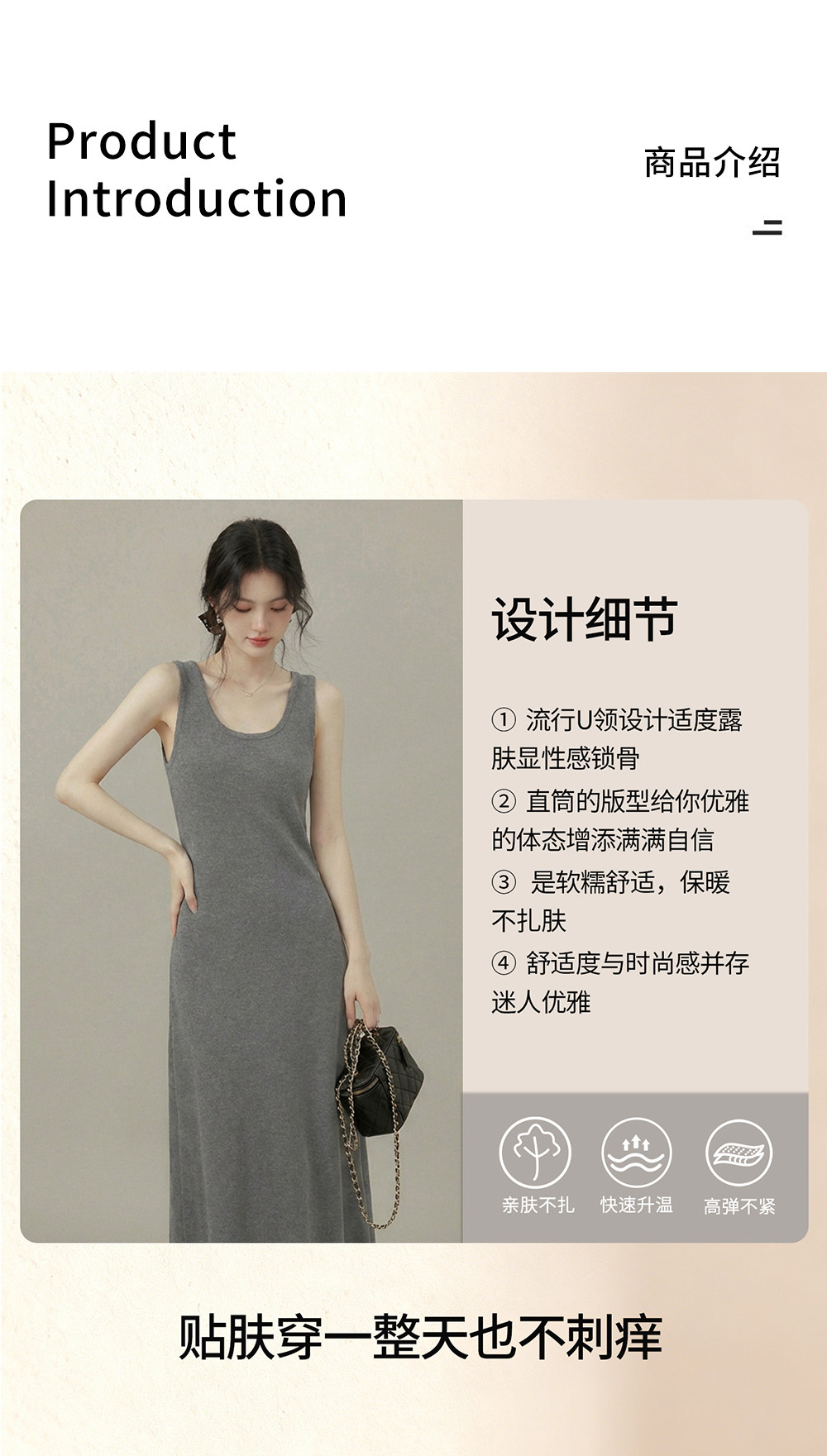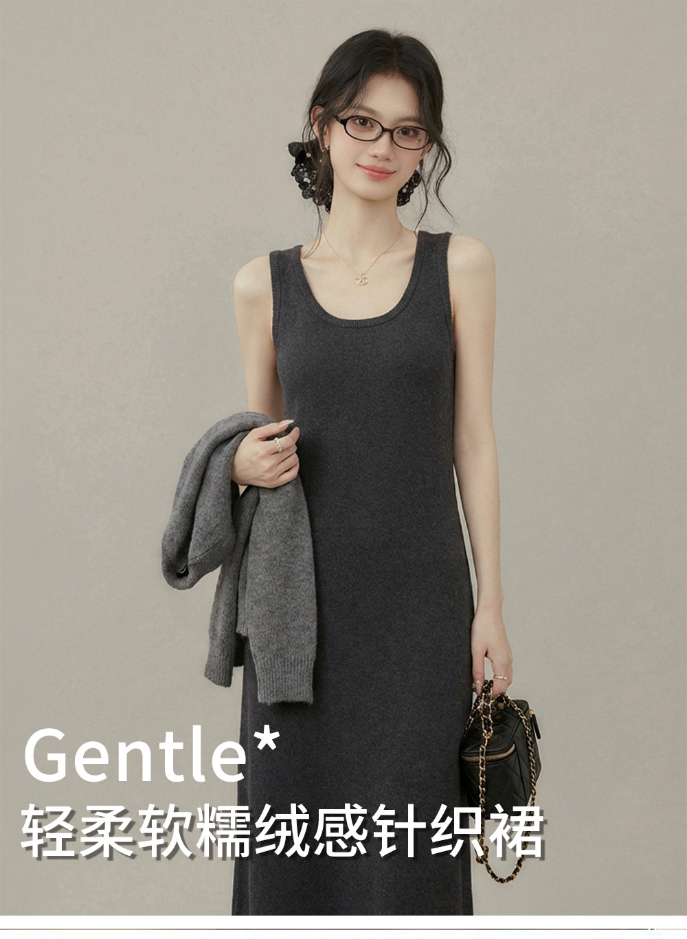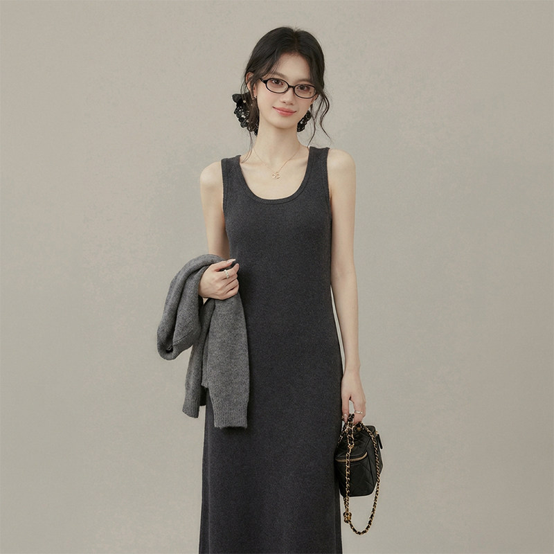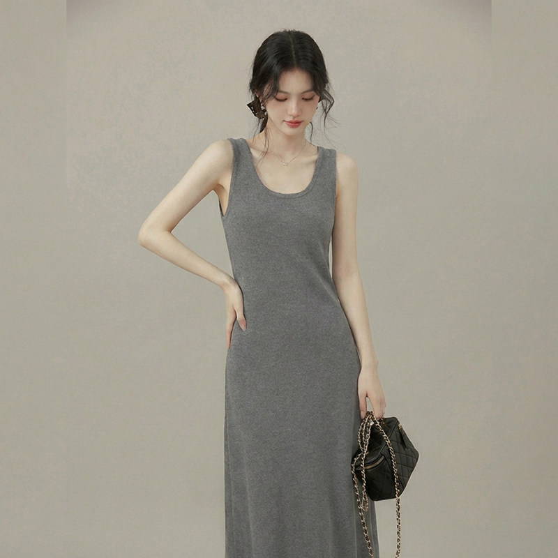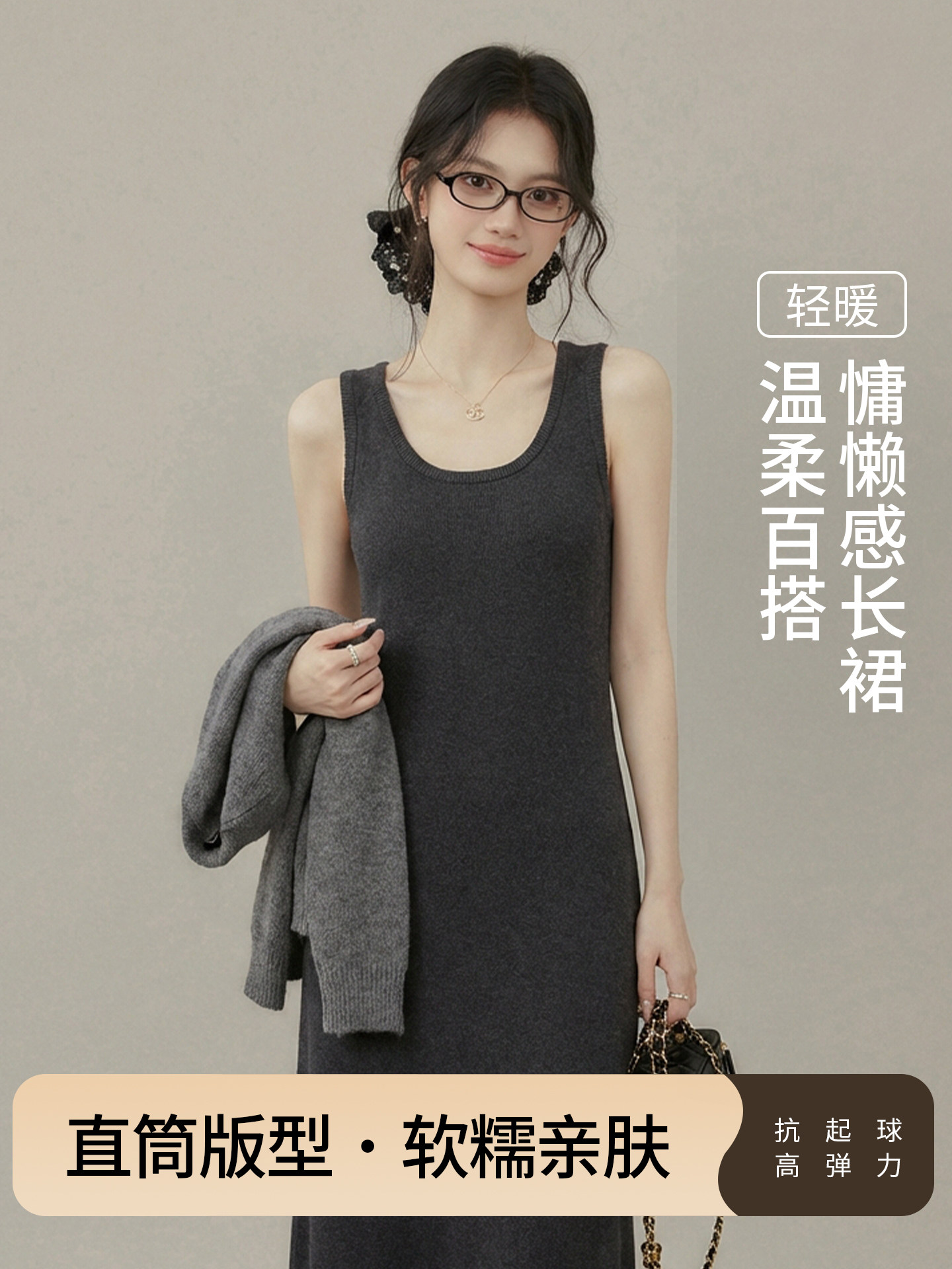 猫人打底针织连衣裙女秋冬长款背心裙灰色直筒宽松内搭吊带裙长裙