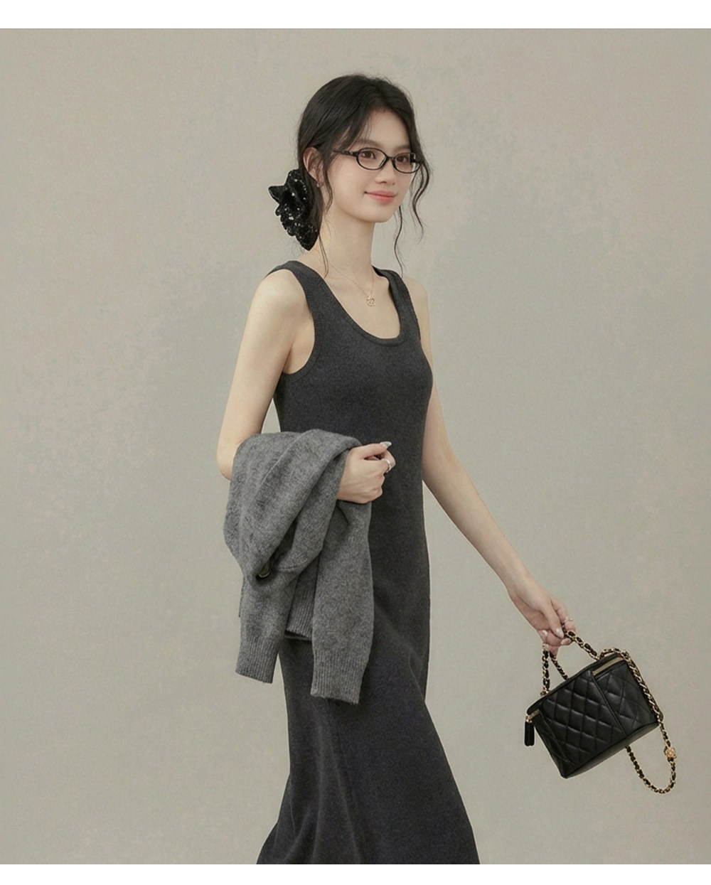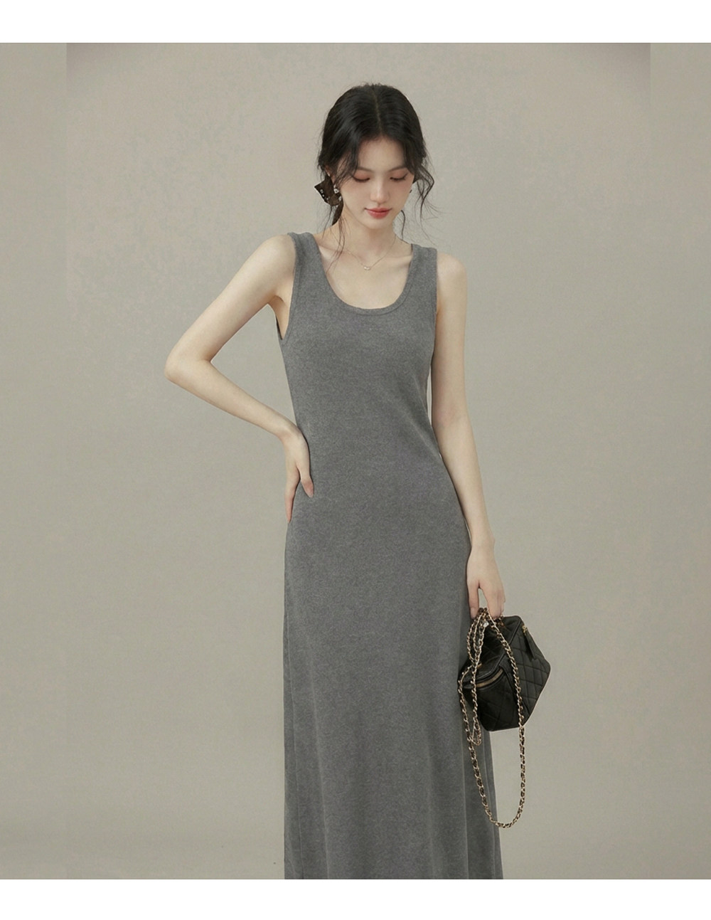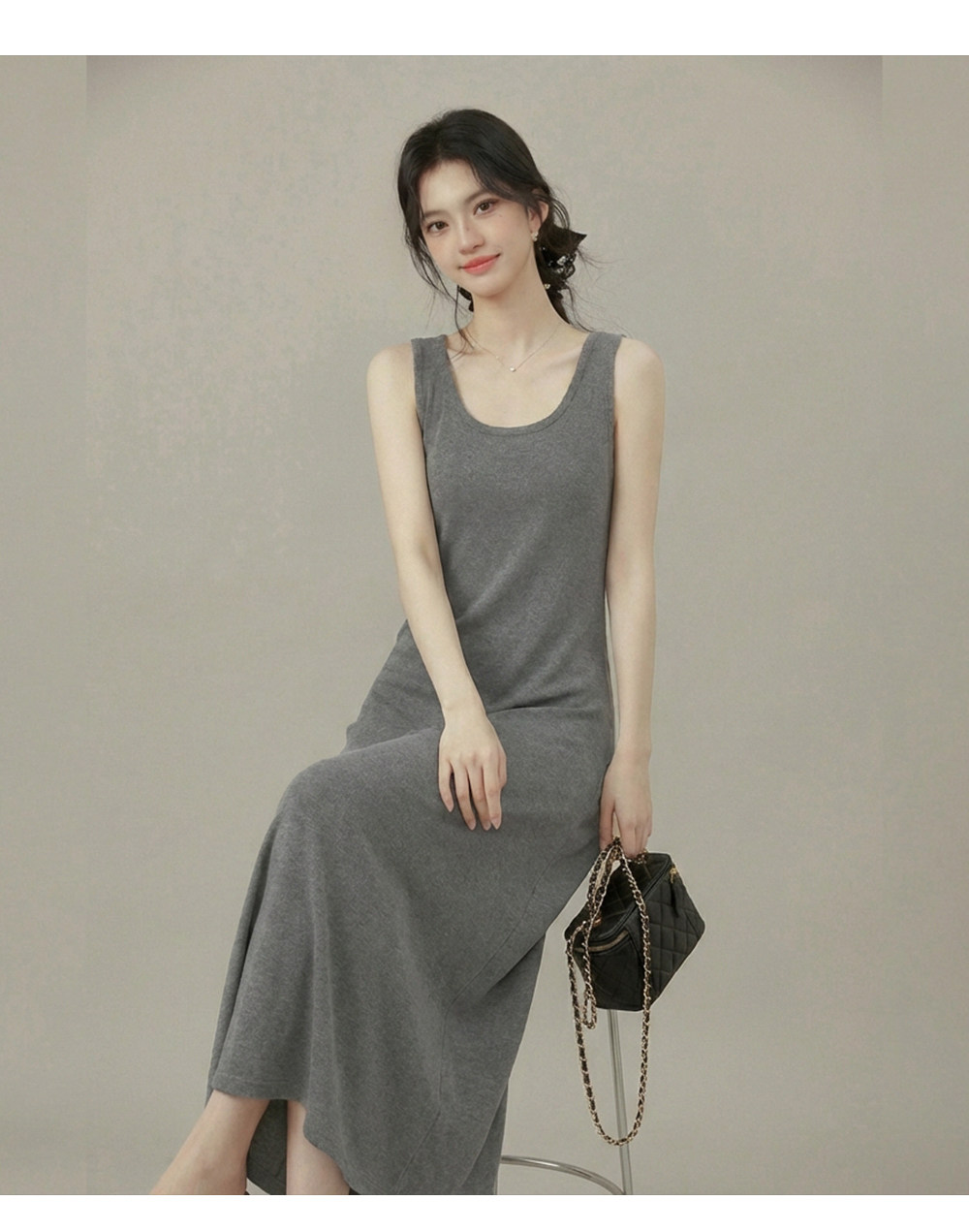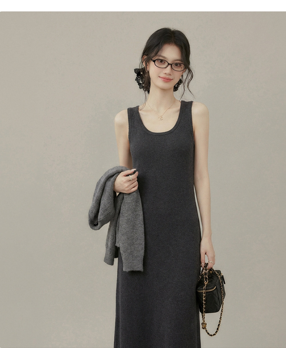 猫人打底针织连衣裙女秋冬长款背心裙灰色直筒宽松内搭吊带裙长裙