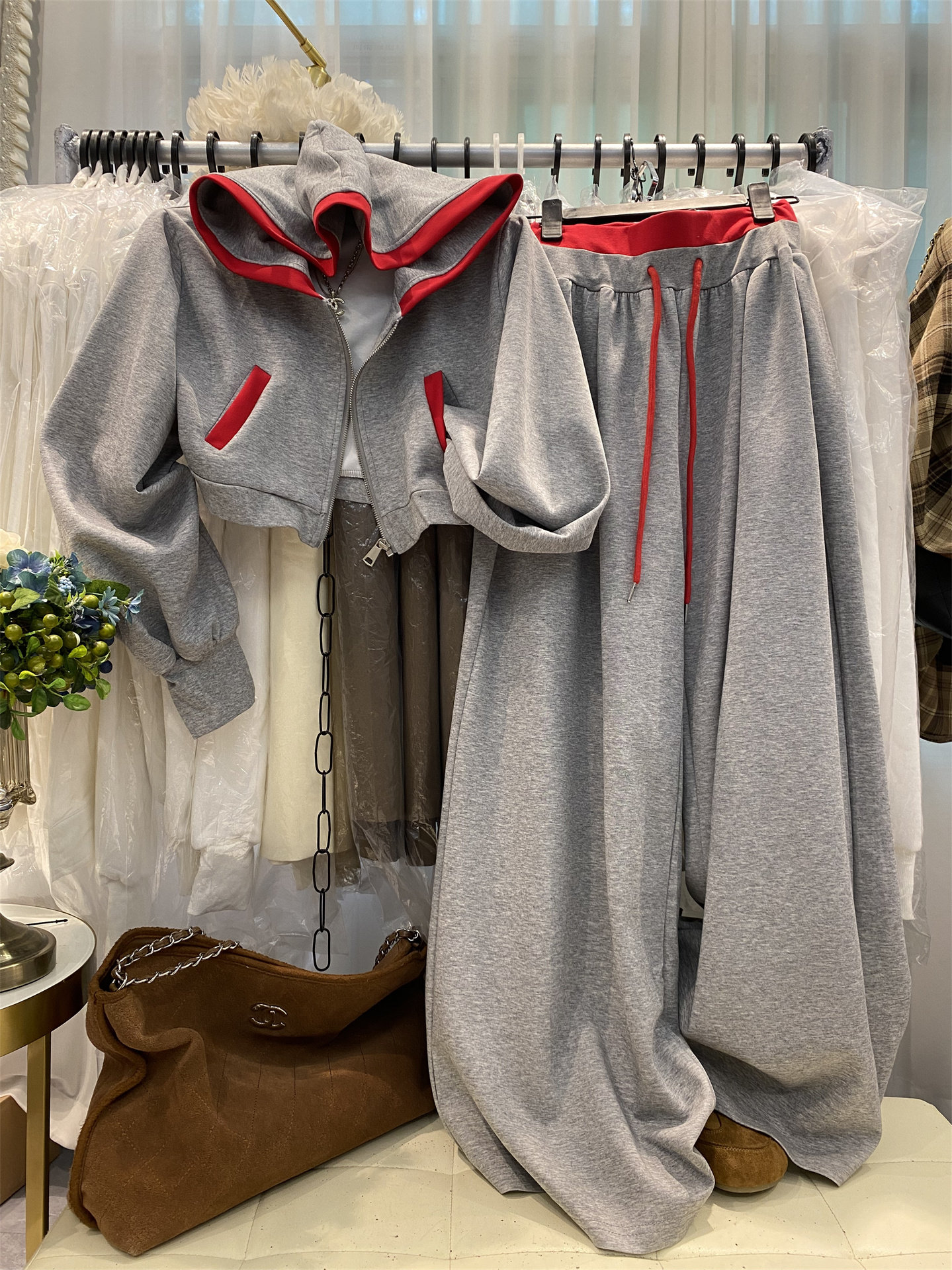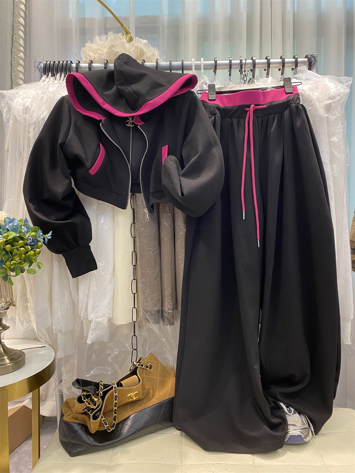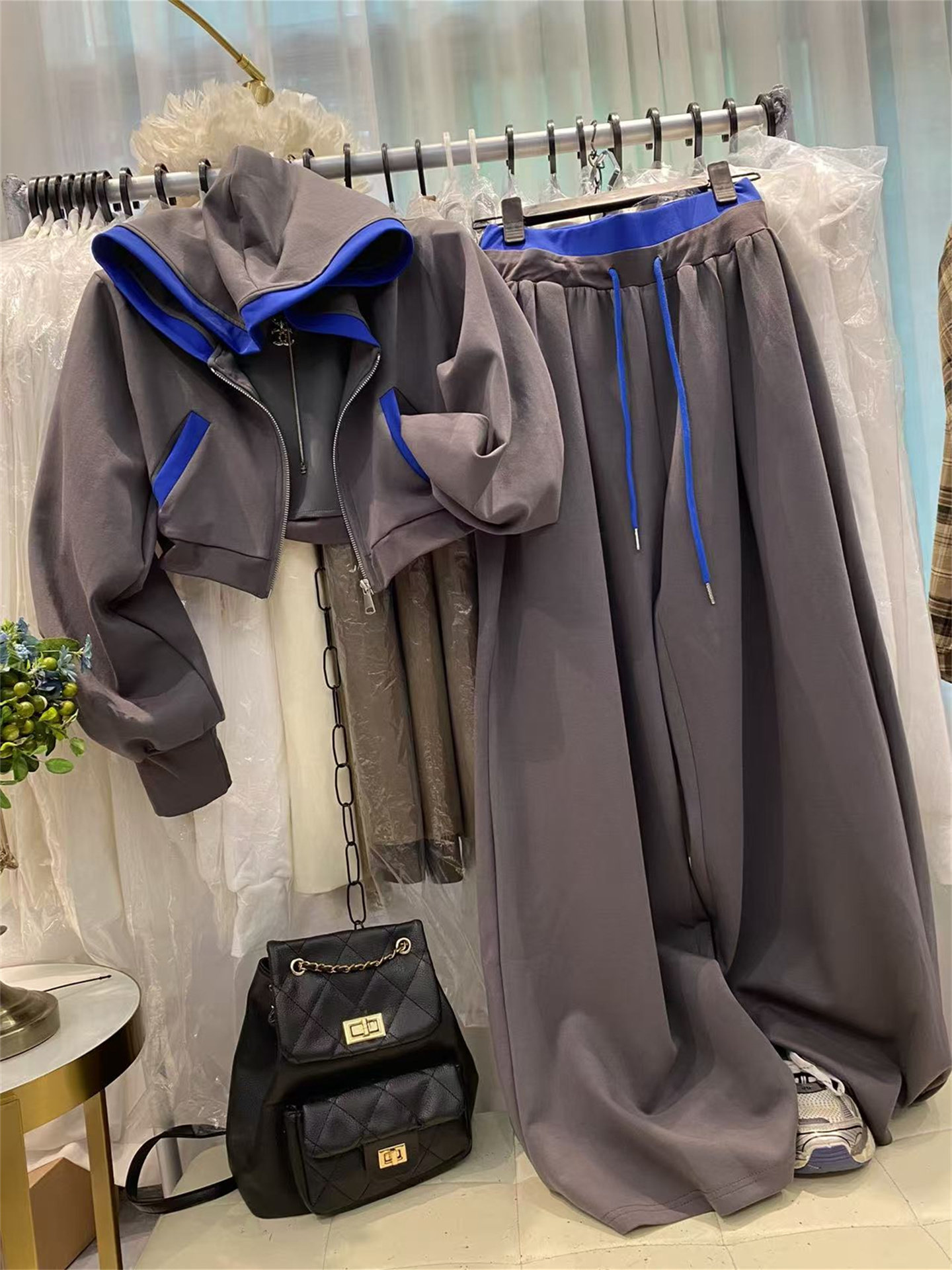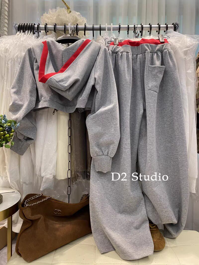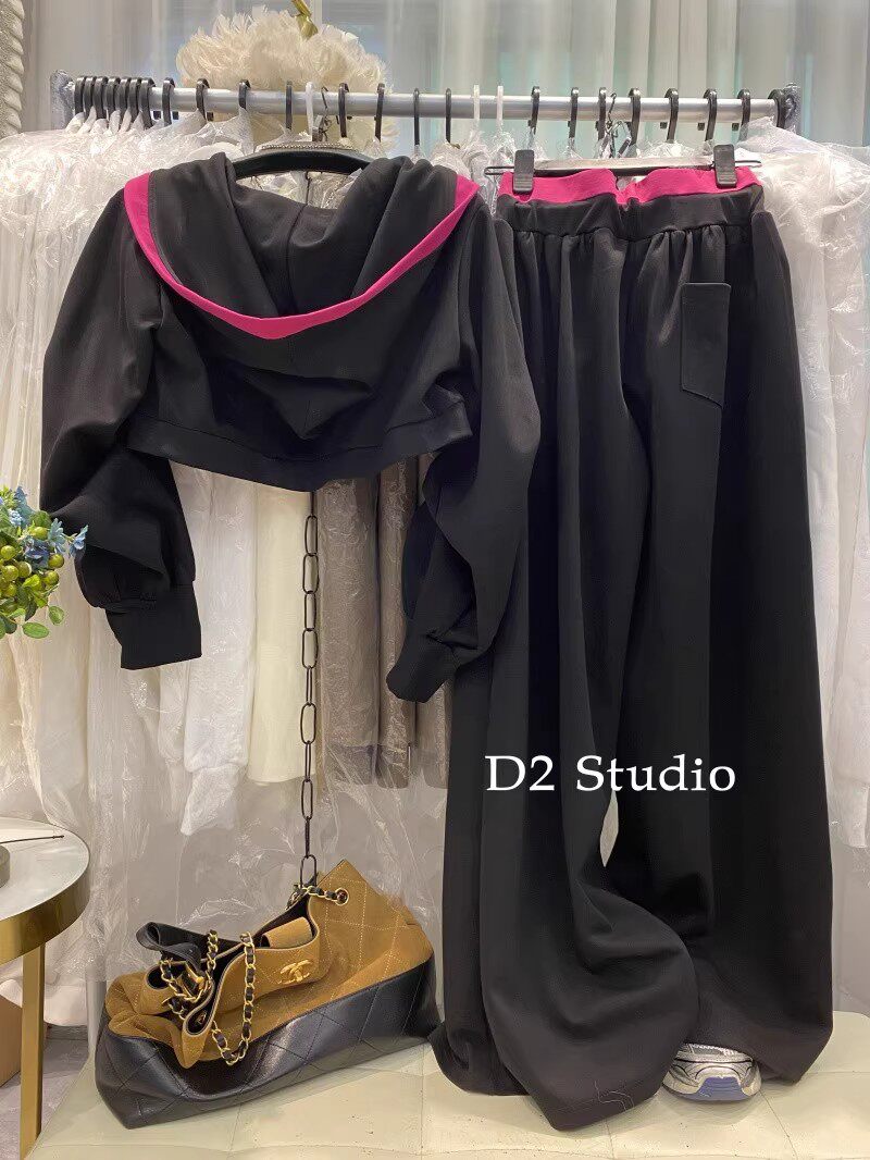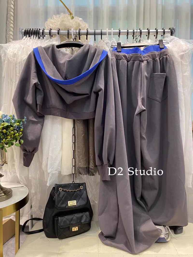 十三行爆款~韩系慵懒风撞色连帽卫衣+高腰显瘦阔腿裤两件套女春季